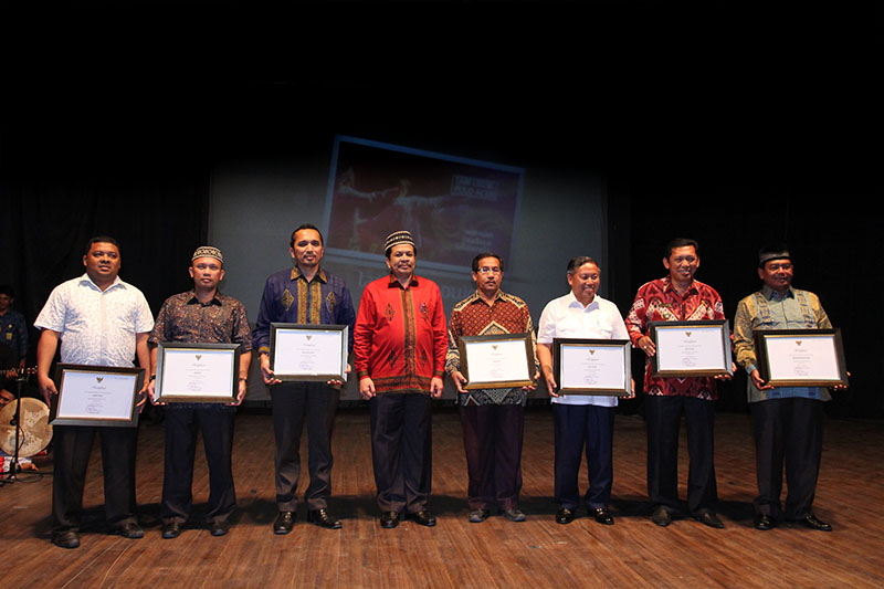 PELAKSANA Tugas (Plt) Gubernur Aceh, Soedarmo yang diwakili Sekretaris Daerah Aceh, Dermawan menyerahkan delapan sertifikat warisan budaya tak benda (WBTB) Aceh dari Kementerian Pendidikan dan Kebudayaan RI kepada sejumlah bupati di Indoor Taman Budaya, Banda Aceh, Jumat (16/12/2016) malam.