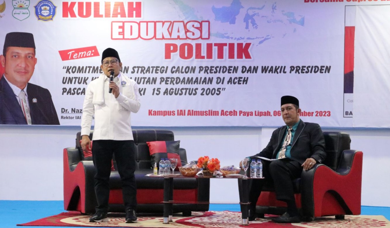 UNTUK kali perdana, tokoh sekaligus politisi Indonesia yang saat ini tercatat sebagai Ketua Umum Parta Kebangkita Bangsa (PKB) Dr (HC) Abdul Muhaimin Iskandar MSi mengisi kuliah edukasi politik di kampus Institut Agama Islam (IAI) Almuslim Aceh, Paya Lipah, Rabu, 6 Desember 2023.