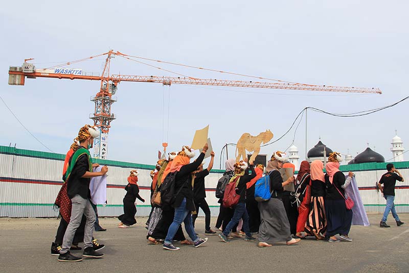 Peserta aksi Hari Harimau Sedunia melewati pembangunan renovasi Masjid Raya Baiturrahman (Foto M Iqbal/SeputarAceh.com)