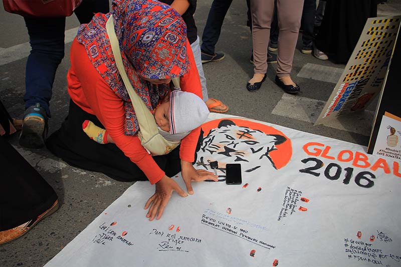 Seorang Ibu membubuhkan dua jempol ketika peringatan Hari Harimau Sedunia di Banda Aceh (Foto M Iqbal/SeputarAceh.com)
