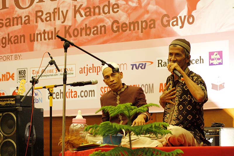 SELAIN Rafly Kande dalam acara ‘Charity for Gayo’ yang diselenggarakan oleh Hermes Hotel, Minggu (7/7) malam juga turut menghadirkan sejumlah seniman Aceh lainnya. Selain penampilan seni tari dan hikayat Aceh, beberapa barang juga dilelang, termasuk kopi luwak Gayo premium seharga Rp 500 ribu.