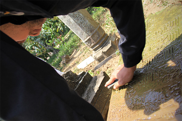 Membersihkan jamur yang melekat pada batu nisan (Foto M Iqbal/SeputarAceh.com)