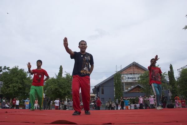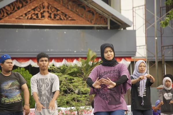 Sejumlah instruktur lain di atas panggung kecil juga ikut meramaikan belajar Seudati massal.