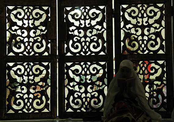 Seorang perempuan membaca Al-Quran di luar pintu masjid Raya Baiturrahman. (Foto M Iqbal/SeputarAceh.com)