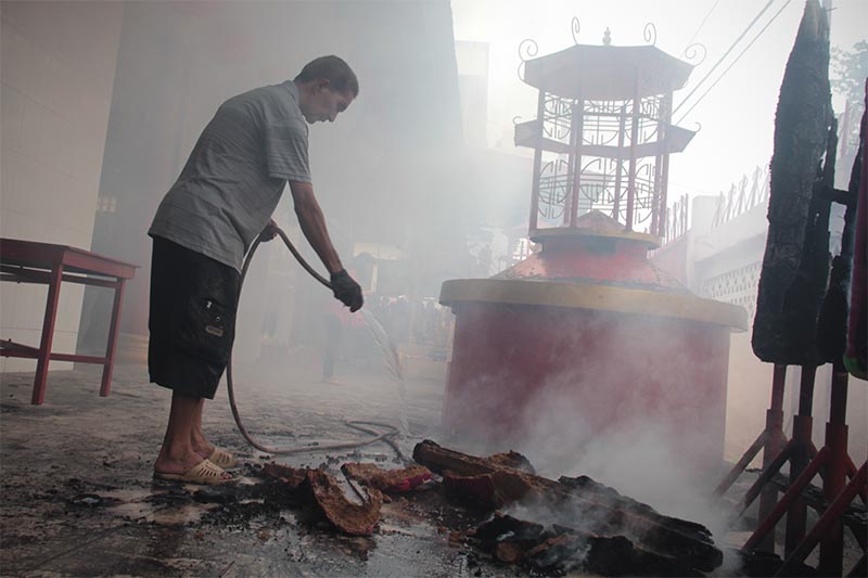 Seorang petugas Vihara membersihkan sisa pembakaran Hio perayaan tahun baru Imlek 2567 di Vihara Dharma Bakti, Peunayong, Banda Aceh (Foto M Iqbal/SeputarAceh.com)