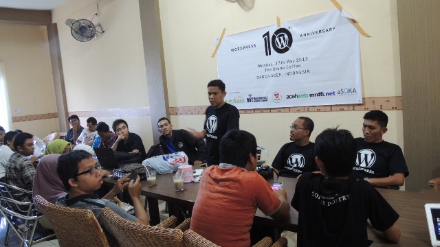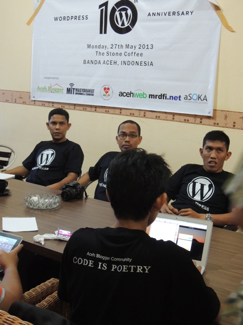 BEGINILAH suasana pertemuan sederhana “WordPress 10th Anniversary” yang berlangsung di Banda Aceh, pada hari Senin (27/5) sore di Warkop The Stone Coffee Lampineung Banda Aceh.
