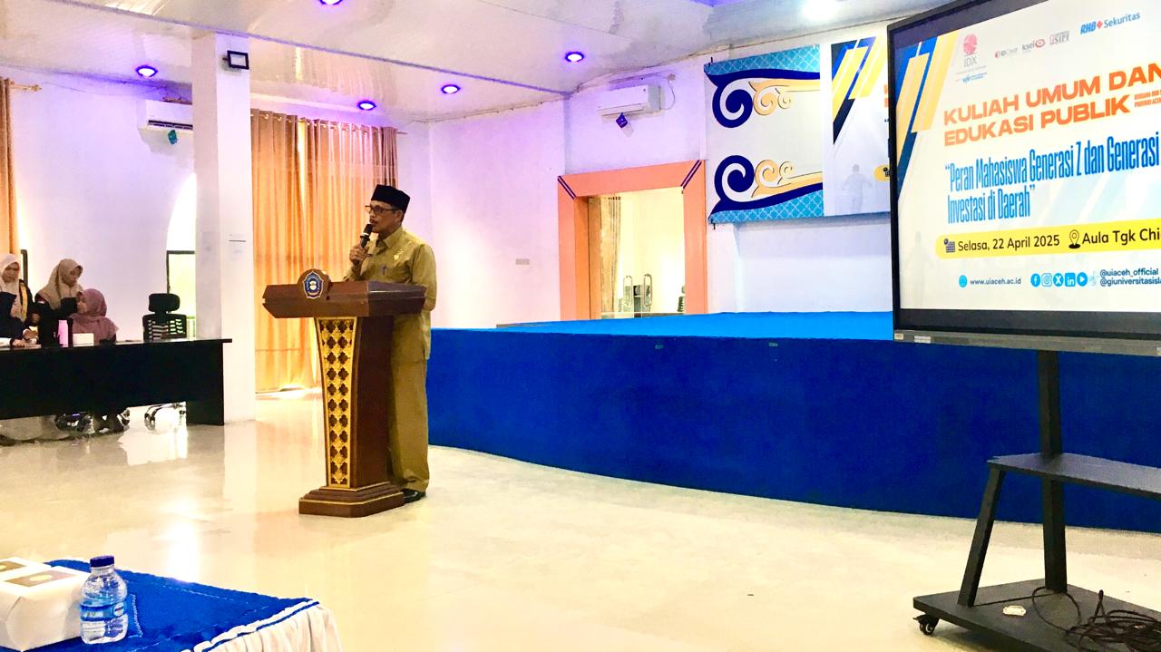 GALERI Investasi Universitas Islam Aceh (UIA) bersama Kelompok Studi Pasar Modal (KSPM) Jeumpa menggelar edukasi publik dan juga kuliah umum yang bertajuk “Peran Mahasiswa Generasi Z dan Alpha dalam Meningkatkan Investasi di Daerah” yang berlangsung Selasa, 22 April 2025 di Aula Tgk Chik Abdurrahman, Kampus Paya Lipah.