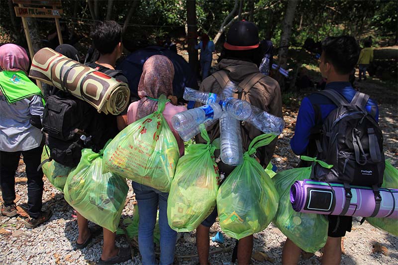 Sekitar 50 kantong plastik besar berisi sampah berhasil di bawa turun oleh relawan dari pantai Lhok Mata Ie ke pos tempat pengumpulan sampah di balai Desa Lampageu, Aceh Besar.[]