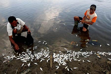 “Ada ikan Beulanet, cabeh, teri, bukum, dan banyak ikan lain yang mati,” kata Zailani warga Cot Keueung yang sedang menyaksikan warga lain yang mengambil ikan tersebut di Krueng Lamnyong.