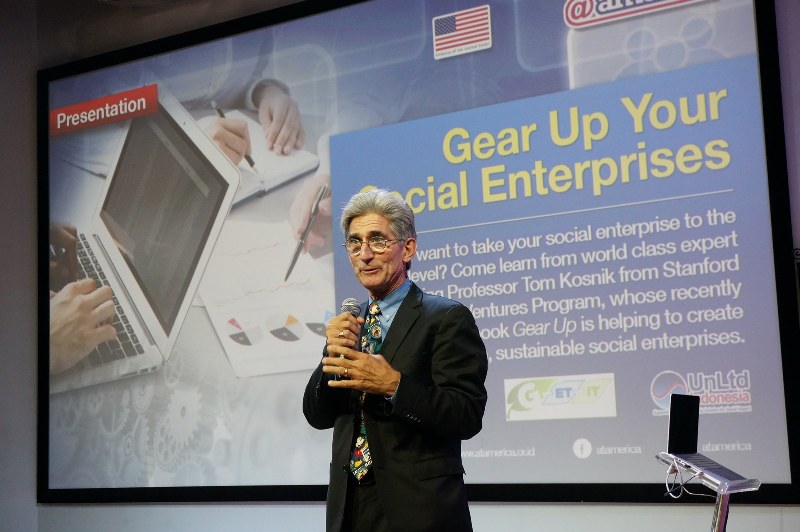 SEBUAH organisasi inkubator wirausaha sosial pemula, UnLtd Indonesia bekerja sama dengan GETIT, Inc., Selasa (16/9/2014) lalu bertempat di @america menyelenggarakan diskusi edukatif tentang pentingnya pengembangan kewirausahaan sosial dalam membangun masyarakat serta komunitas yang mandiri secara sosial ekonomi dengan menghadirkan salah satu tokoh dari Universitas Stanford, Tom Kosnik, sebagai pembicara utamanya.